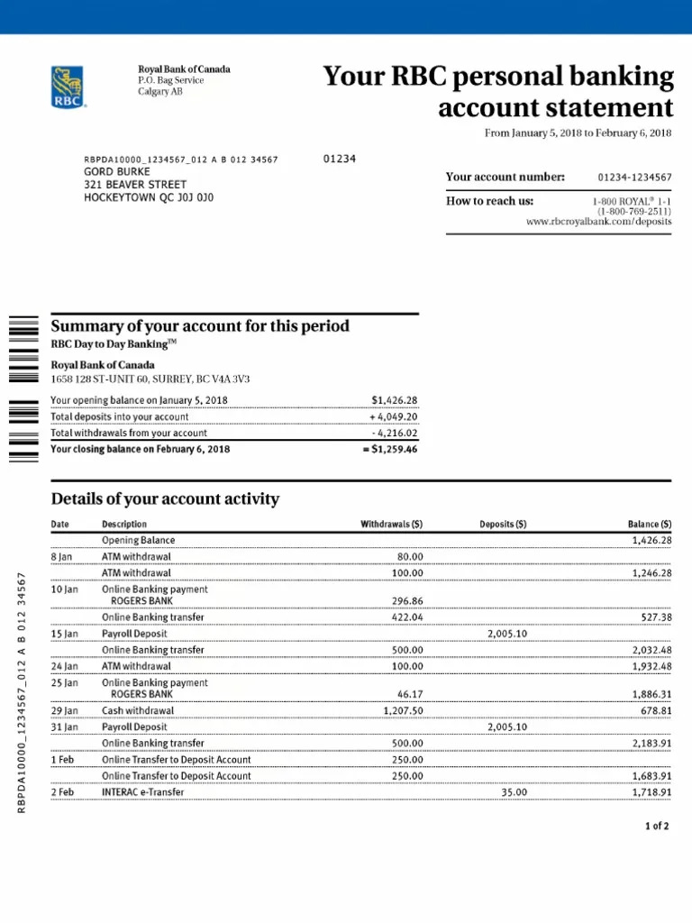 A Checking Account Statement typically includes the bank's logo, your account details, a list of transactions, and the account balance. Here is a sample image.